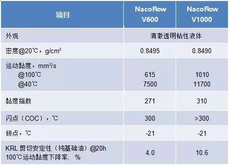 超高黏度茂金屬PAO(mPAO)基礎(chǔ)油在黏度指數(shù)、低溫流動(dòng)性、剪切安定性等多方面具有優(yōu)異的性能,可作為黏度指數(shù)改進(jìn)劑用于車輛齒輪油中,改進(jìn)剪切安定性。目前,上海納克已商業(yè)化兩個(gè)超高黏度mPAO產(chǎn)品NacoFlow V600和NacoFlow V1000,100℃運(yùn)動(dòng)黏度分別達(dá)到了600mm2/s和1000mm2/s,目前國(guó)際上還沒(méi)有第二家能提供同等黏度的商業(yè)化mPAO產(chǎn)品。NacoFlow V600和V1000的基本性能見(jiàn)表1。NacoFlow V600與V1000比較,黏度較小,所以其剪切安定性更好,其在車輛齒輪油中具有更好的應(yīng)用前景。