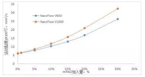 NacoFlow V600和V1000也具有良好的增稠能力,其在150N的III類基礎(chǔ)油中的增稠能力曲線見(jiàn)圖1。